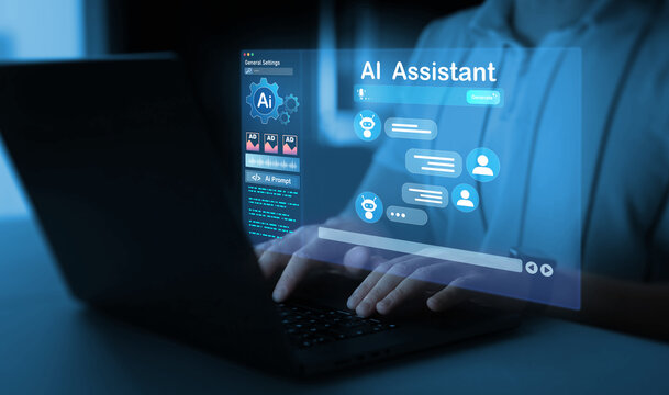 Interaction with the Ai assistant to solve some tasks more easily. Image generator, documents, marketing and advertising, bot writing and coding.Person using laptop with Ai Content Generator.