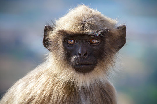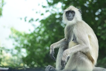 Black faced monkey, grey langur sitting on a tree in Rishikesh,
