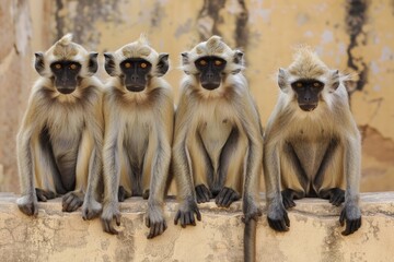 Hanuman langur monkeys (Semnopithecus entellus) sitting on wall, Ranthambhore National Park, Rajasthan, India