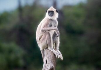 Northern plains gray langur monkey (Semnopithecus entellus) sitting on a tree branch in the forest