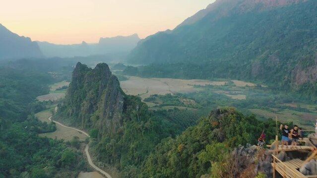 Aerial view of Nam Xay view point in Vang Vieng, Laos. Cinematic drone shot of famous tourist travel destination at sunset
