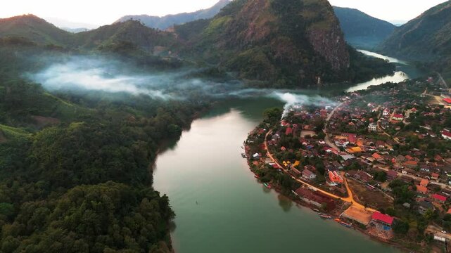 aerial sunset view of Nong Khiaw village in the Luang Prabang Province of northern Laos on the Nam Ou River drone footage travel destination south east Asia