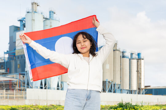 Cheerful asian girl with laotian flag standing in front of factory