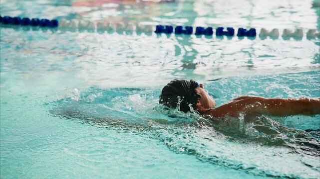 Athletic Young man swimming the back crawl in a pool. Swimming competition.