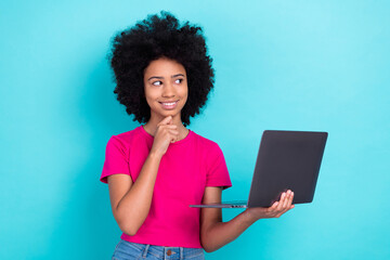 Photo of charming child with afro chevelure wear pink t-shirt hold laptop hand on chin look empty space isolated on blue color background