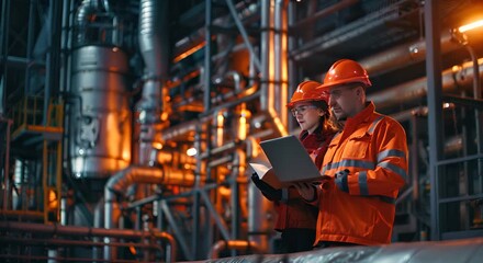 Petrochemical industry engineers teamwork using laptop computer at night on oil refinery construction site, technicians inspecting petroleum gas system, maintaining power and energy infrastructure.