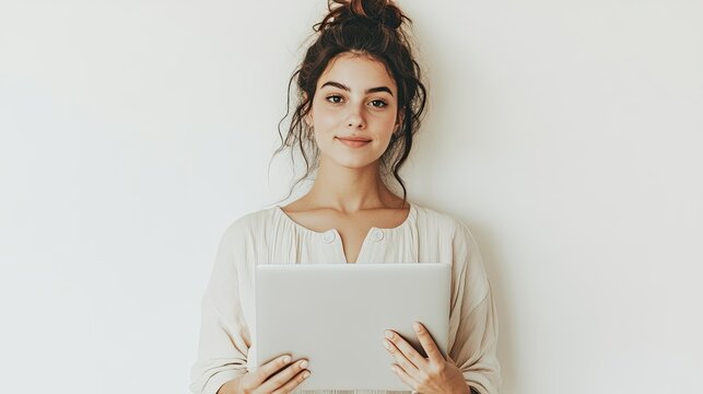 Young pretty woman holds laptop computer over white wall. Social media, web branding concept. Aesthetic neutral pastel beige color