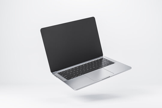 Close up of modern laptop with blank black screen with copyspace for your text or logo on abstract light background. 3D rendering, mock up