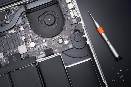 disassembled laptop on a white background, laptop repair, details of a laptop