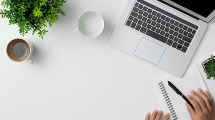 Work online on a laptop at a white table in a cafe. Meeting on the website. A blogger. Ideas for working on the Internet. View from above.