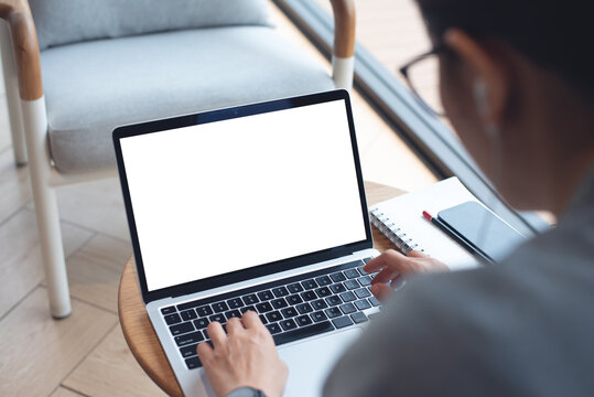Over shoulder view of woman student elearning looking at white mock up blank screen using laptop computer learning online, remote working, searching on web. Website mockup display template.