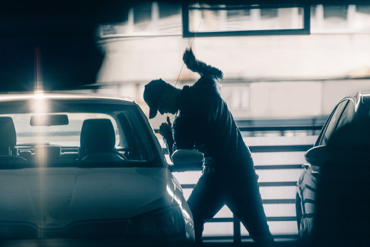 Car theft thief stealing vehicle. Street crime man breaking in automobile to steal.
