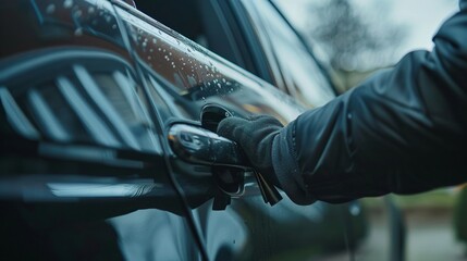 The image shows a gloved hand grasping a car door handle, appearing to unlock it, indicating a suspicion of an unauthorized entry or potential theft during a rain.