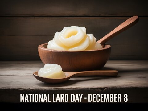 A rustic wooden bowl filled with fluffy lard on december eighth for national lard day
