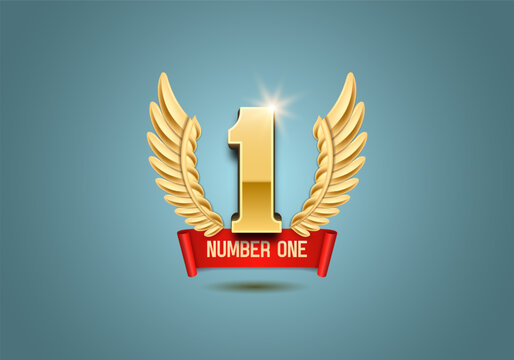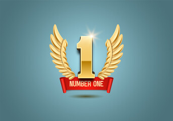 Winner award. Number one. Golden wings with red ribbon. Vector illustration.