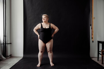 Art nude, perfect naked body, sexy young woman on dark background, black and white studio shot