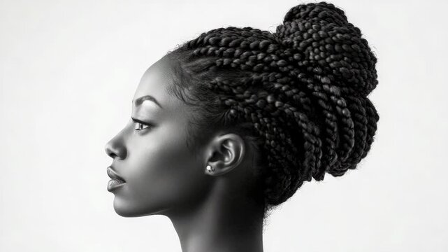 A black woman looking away, wearing a large braided hairstyle and high side part, against white background.