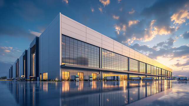 Realistic render of large logistic business transport warehouse dock station. Factory and transport house. Commercial office building
