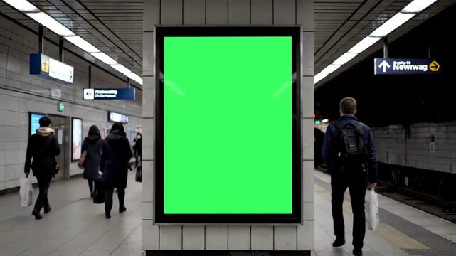 A large vertical illuminated billboard with a blank green screen stands on a modern subway platform offering a perfect mockup for advertising as people walk by