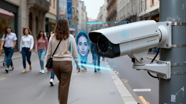 Digital interface of surveillance camera monitoring urban street. Facial recognition technology scanning diverse pedestrians.