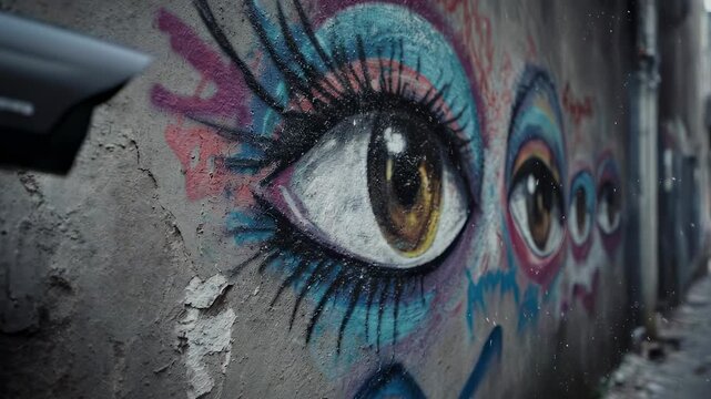 A security camera watches an alley wall painted with a large, colorful graffiti eye.