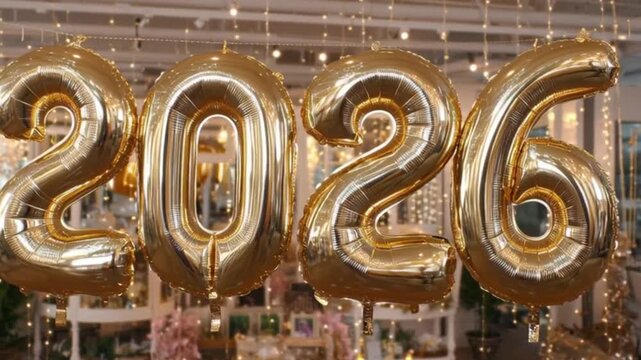 Happy New Year 2026. Combination of small and large typography in the shape of a Spain ribbon for the year 2026. Abstract red yellow ribbon flag with sparkling fireworks on a red and white background