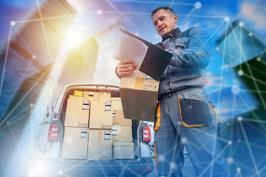 Courier checking delivery documents and packages near van full of parcels, concept of shipping, logistics and last mile delivery. Logistics, Delivery.