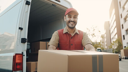Delivery driver loading packages into a van, urban logistics, last-mile delivery process