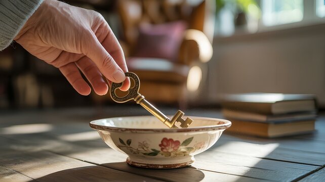 Vintage key resting on a floral bowl, a symbolic latchkey experience evoking nostalgia