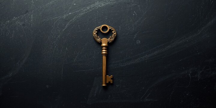 Vintage golden latchkey resting on a blackboard surface used as copy space, suitable for educational or instructional layouts