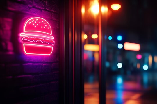 A neon sign of a hamburger illuminated on a brick wall at night, with a blurred background of city lights. The sign represents fast food, appetite, and urban life.