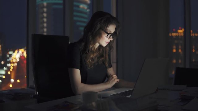 Independent employee works late into the night using her laptop in bed