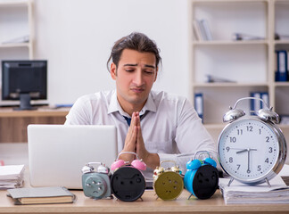 Young male employee afraid of missing deadline at workplace