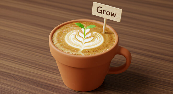 Creamy coffee cup promoting warmth and rejuvenation with inspirational message