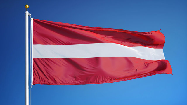 Latvia flag waving against clean blue sky, close up, isolated with clipping path mask alpha channel transparency