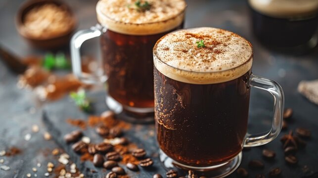 Product photo of nitro cold brew coffee, on slate surface. studio lighting.
