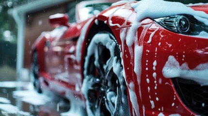 Technology, Automatic car wash machine in action. Car going through an automated wash. High-pressure water spray in the wash machine. Dotted with soap suds. Tunnel Wash Automatic Car.