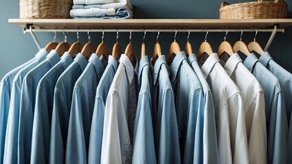 Neatly arranged rack of freshly laundered blue and white shirts on wooden hangers against a teal wall with space for text or design insertion.