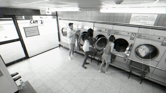 High Angle LS CCTV Style Three Young Adults use the Launderette