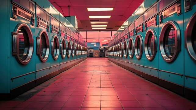 A row of industrial washing machines in a laundry room. Created with Generative Ai technology.