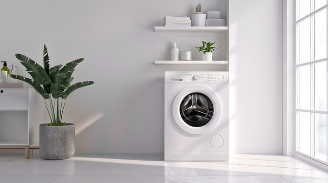 Washing machine in the laundry room style, interior concept, dirty clothes decor coffee table with vase of plant.