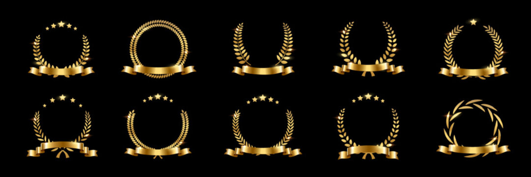 50 Various Gold Wreaths isolated on dark background. Golden laurel wreath collection. Elements for design