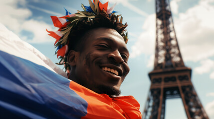 AI Generated Image. Happy ethnic athlete in Paris wearing laurel wreath and wrapped in French flag