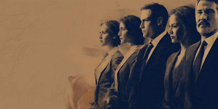 Male and female attorneys on a halftone modern abstract background. Law firm, lawyer, legal graphic for personal injury, medical malpractice or defense law firm website