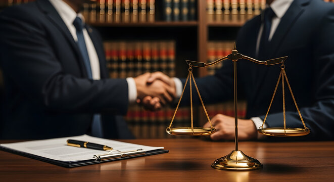Lawyers shaking hands legal agreement justice scales contract law firm partnership success teamwork collaboration attorneys professional legal services handshake deal