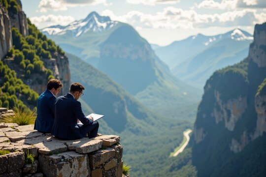Signing a Business Contract with a Stellar Backdrop: Client and Lawyer on a Cliff Facing a Majestic Mountain View