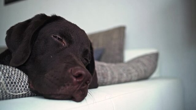 Close up shot of a tired large brown dog resting its head on a modern white couch.