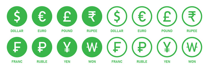 Currency symbols icons set. Dollar, Euro, Pound, Rupee, Franc, Ruble, Yen, Won in green color, vector illustration.