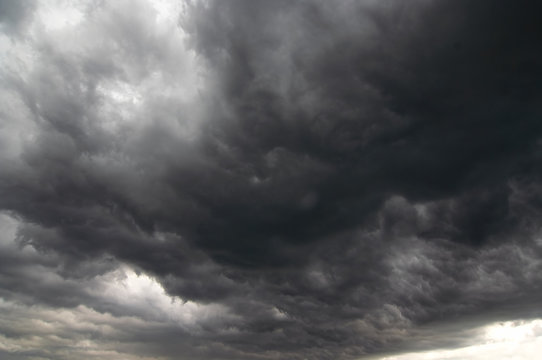 Dramatic sky at sunset, dangerous heavy gray red color clouds in sky, abstract sky and nature background