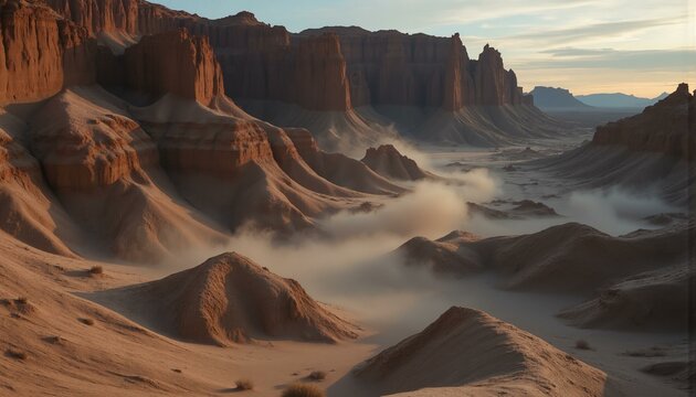 A rugged, barren landscape of eroded badlands, with winding gullies and twisted rock formations against a leaden sky backdrop.